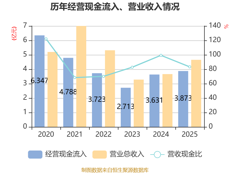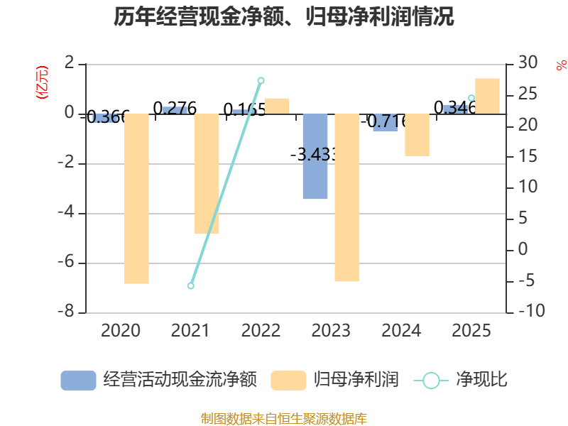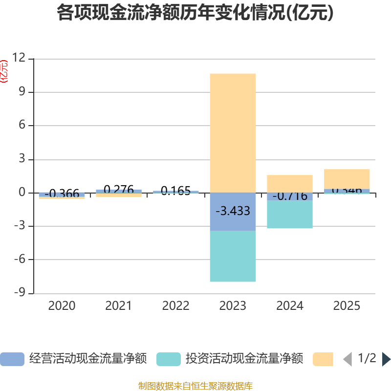截至2025年,公司经营活动现金流净额为3464.94万元,同比增加1.06亿元;筹资活动现金流净额1.76亿元,同比增加1776.48万元;投资活动现金流净额-1158.08万元,上年同期为-2.47亿元。