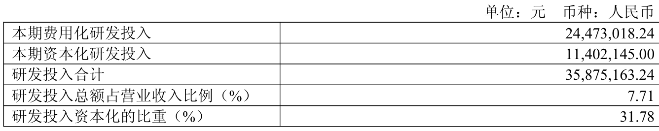 2025年全年,公司研发投入金额为3587.52万元,同比增长26.12%;研发投入占营业收入比例为7.71%,相比上年同期下降0.06个百分点。此外,公司全年研发投入资本化率为31.78%。