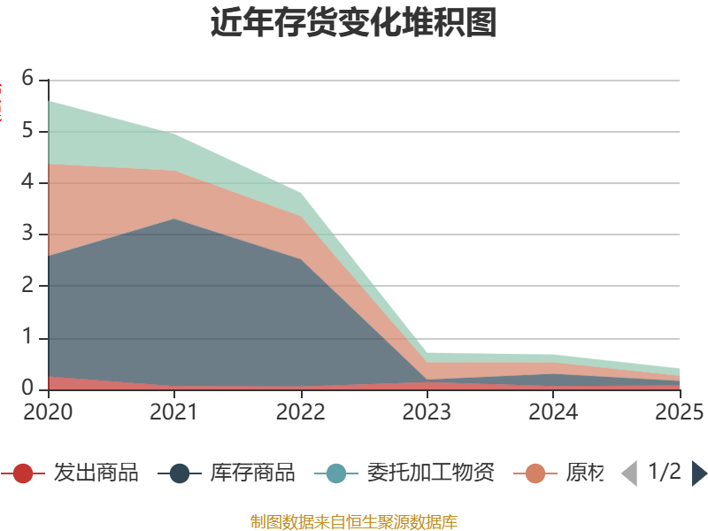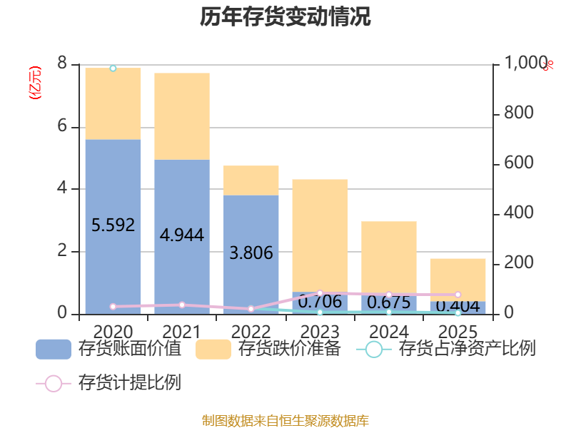 从存货变动来看,截至2025年末,公司存货账面价值为4042.15万元,占净资产的4.04%,较上年末减少2704.91万元。其中,存货跌价准备为1.36亿元,计提比例为77.15%。